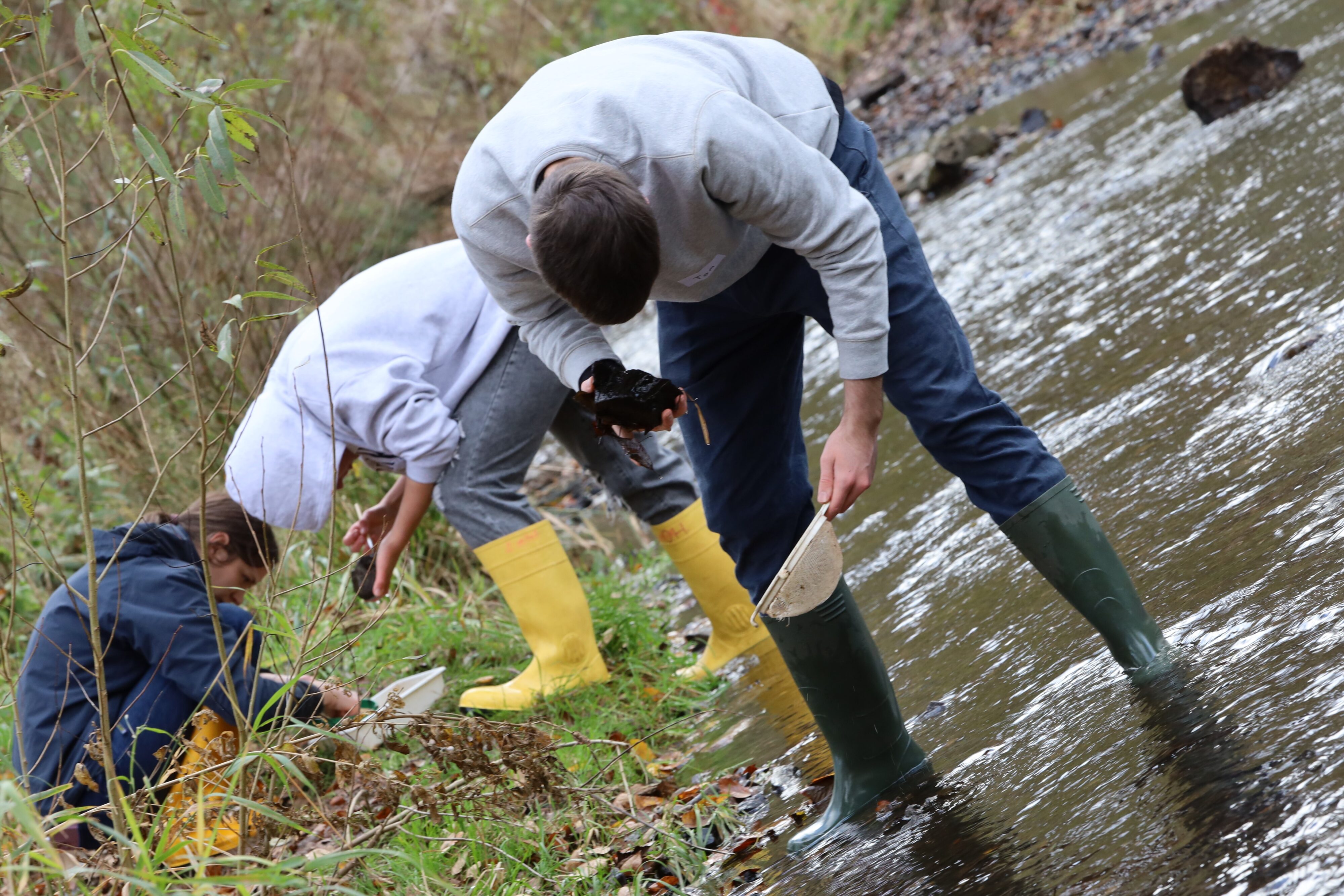 Gemeinsam mit der Biologin Roswita Hubbertz machten sich die Kurse nach einer theoretischen Einweisung ausgerüstet mit Gummistiefeln und Sieben auf, um Proben für die Auswertung der Gewässergüte der Urft zu sammeln. Die ereignisreiche Zeit in der Natur tröstete sogar über den ein oder anderen vollgelaufenen Gummistiefel hinweg. Im Gewässer aufgefundene Lebewesen wurden als Bioindikatoren für die Belastung des Gewässers verwendet, sodass der Saprobienindex und damit die Wasserqualität ermittelt werden konnte. Die hohe Anzahl an Bachflohkrebsen, Steinfliegenlarven, Libellenlarven und Köcherfliegenlarven ließ den Rückschluss zu, dass es sich bei der Urft um ein Gewässer mit guter Gewässergüte handelt. Die Analyse der Gewässerstruktur sowie physikalisch-chemische Untersuchungen der Urft folgten am zweiten Praktikumstag.