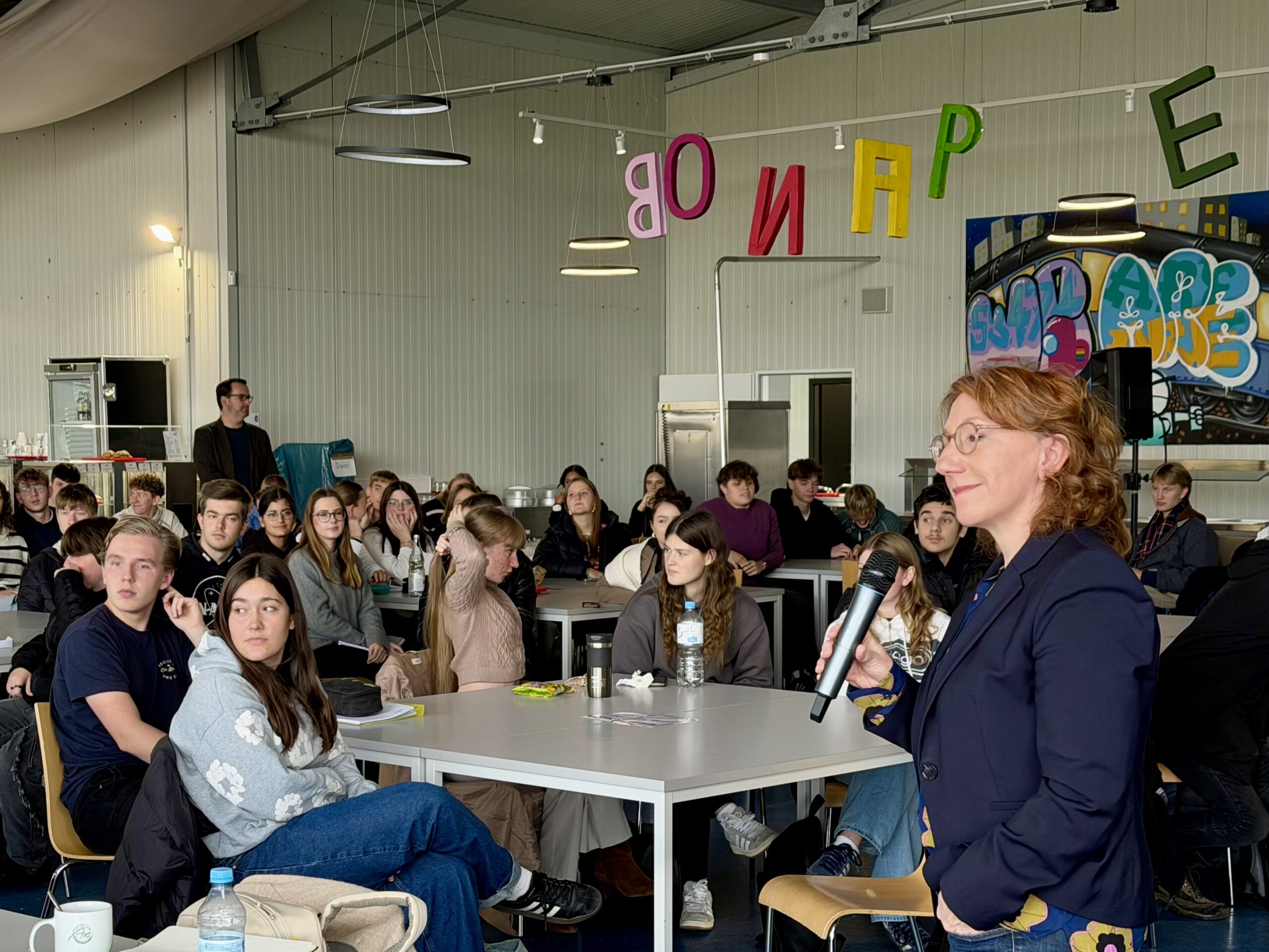 Rund 130 Schüler*innen aus der Jahrgangsstufe 12, ergänzt durch die Leistungskurse Sozialkunde der Klassen 10 und 11, kamen zusammen, um gemeinsam mit der Landtagsabgeordneten über die Bedeutung historischer Erfahrungen für die Demokratie von heute zu sprechen.